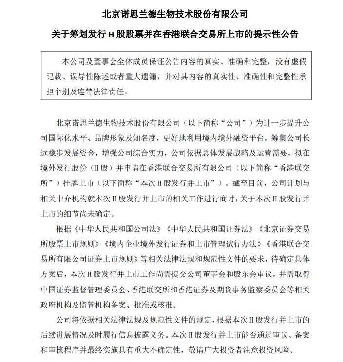 10月10日,诺思兰德(920047.BJ)发布公告,公司计划在境外发行股份(H股)并申请在香港联合交易所有限公司(简称“香港联交所”)挂牌上市。截至目前,公司计划与相关中介机构商讨本次H股发行并上市的相关工作,细节尚未确定。